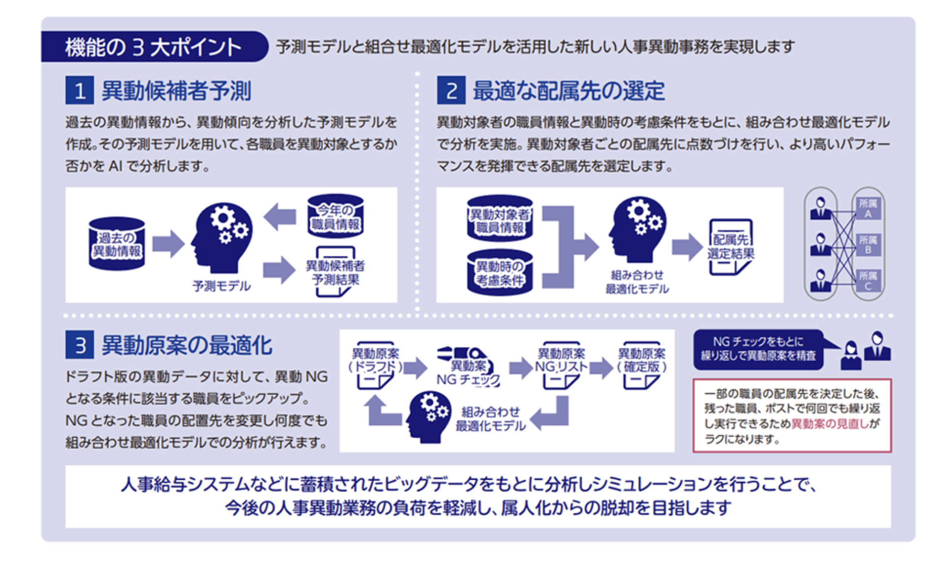 福島市では、NECの「人事異動AI支援ソリューション」を導入し、人事業務の効率化と高度化を図っています。このシステムは、過去の異動履歴や人事情報をAIで分析し、異動候補者の予測や最適な配属先の選定を自動化します。