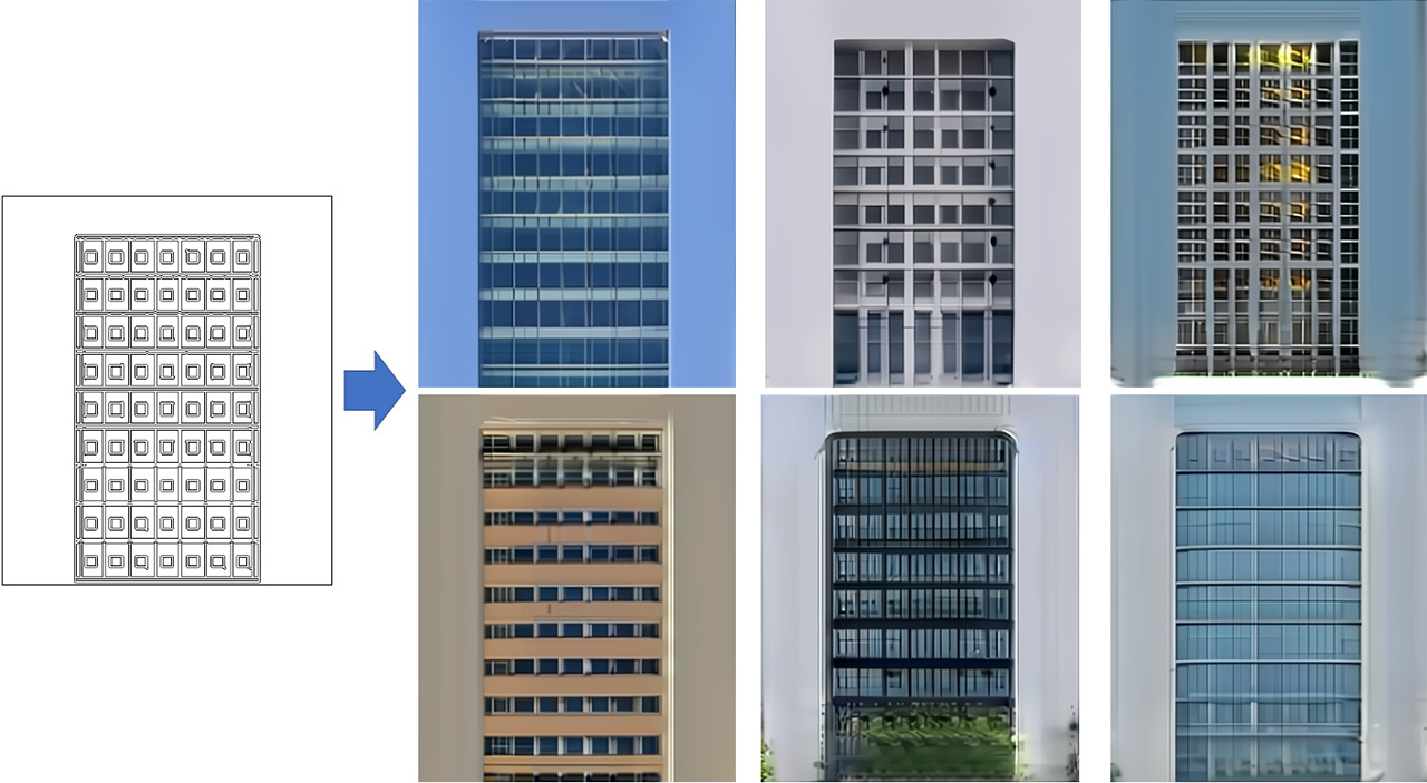 大林組がアメリカのSRIと共同開発したAiCorbは、建物のスケッチや3Dモデルを読み込ませるだけで、複数のファサードデザイン(建物の正面から見た外観)を自動生成が可能です。