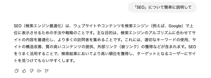 例えば、「SEOについて簡単に説明して」と入力すると、AIがその内容に適した文章を作成します。これにより、ブログ記事やニュース記事、商品説明、さらには詩や小説など、さまざまな種類の文章を生成できるため、幅広いライティング業務の効率化を実現します。