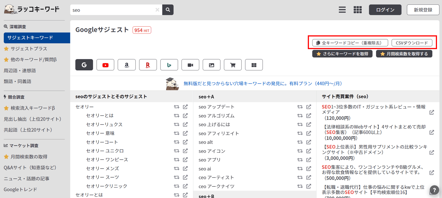 一覧表示された関連キーワードをCSVデータでダウンロードすることも可能です。