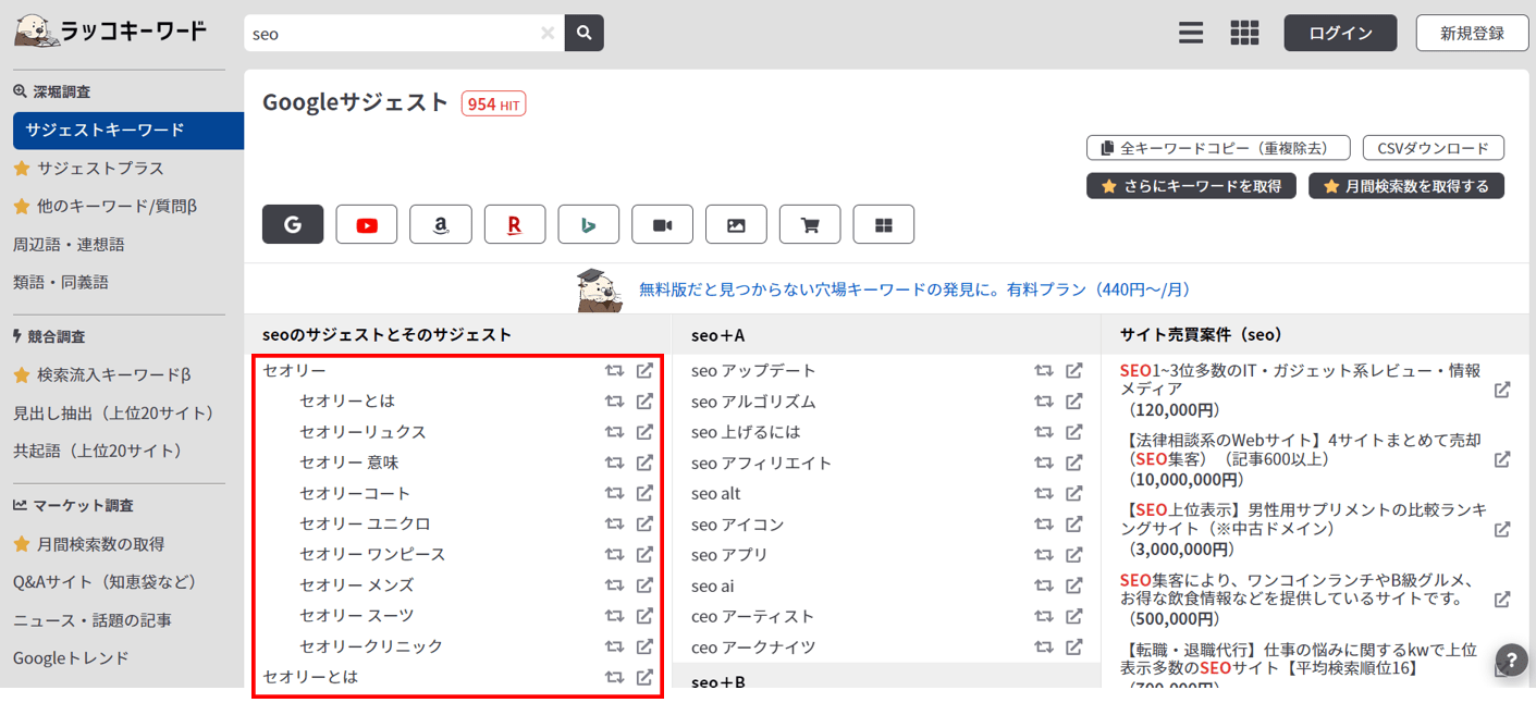 ※右側の「サジェスト(Google)」をクリックすることで、他の検索エンジンやキーワードの月間検索数なども選択可能です。
