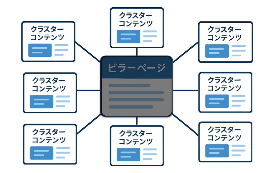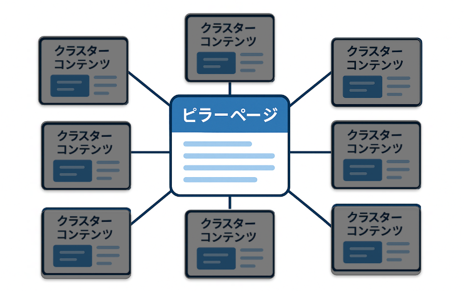トピッククラスターは、ピラーコンテンツとクラスターコンテンツを内部リンクでつなぎ、SEO効果を高める戦略です。