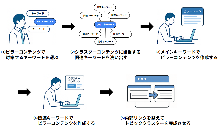 続いては、トピッククラスターをどのように設計し、SEOに活かしていくのか、具体的な手順をご紹介します。