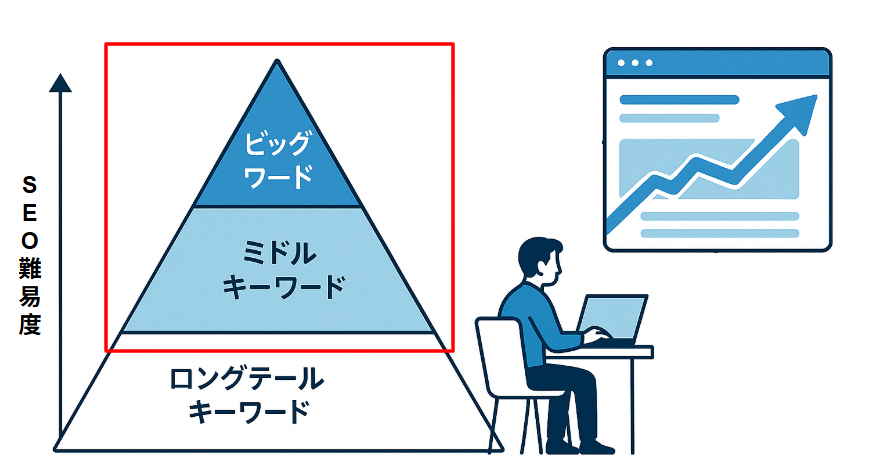 トピッククラスターの大きなメリットの一つは、ビッグワードやミドルワードといった検索ボリュームの多いキーワードでも、上位表示が狙えるようになる点です。