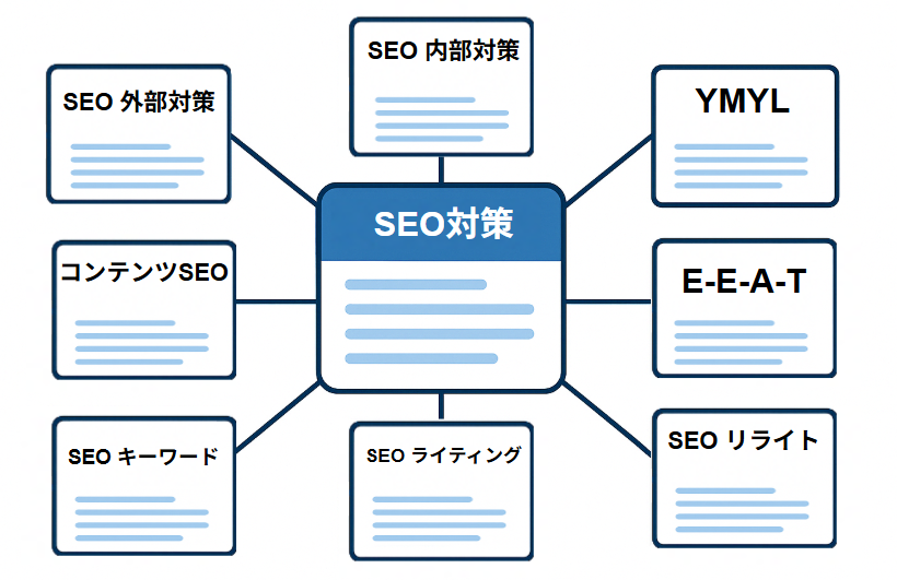 そうすることで、「SEO」というキーワードで対策したページの評価を高めつつ、当社サイトがSEOというジャンルでの信頼を高める施策となります。