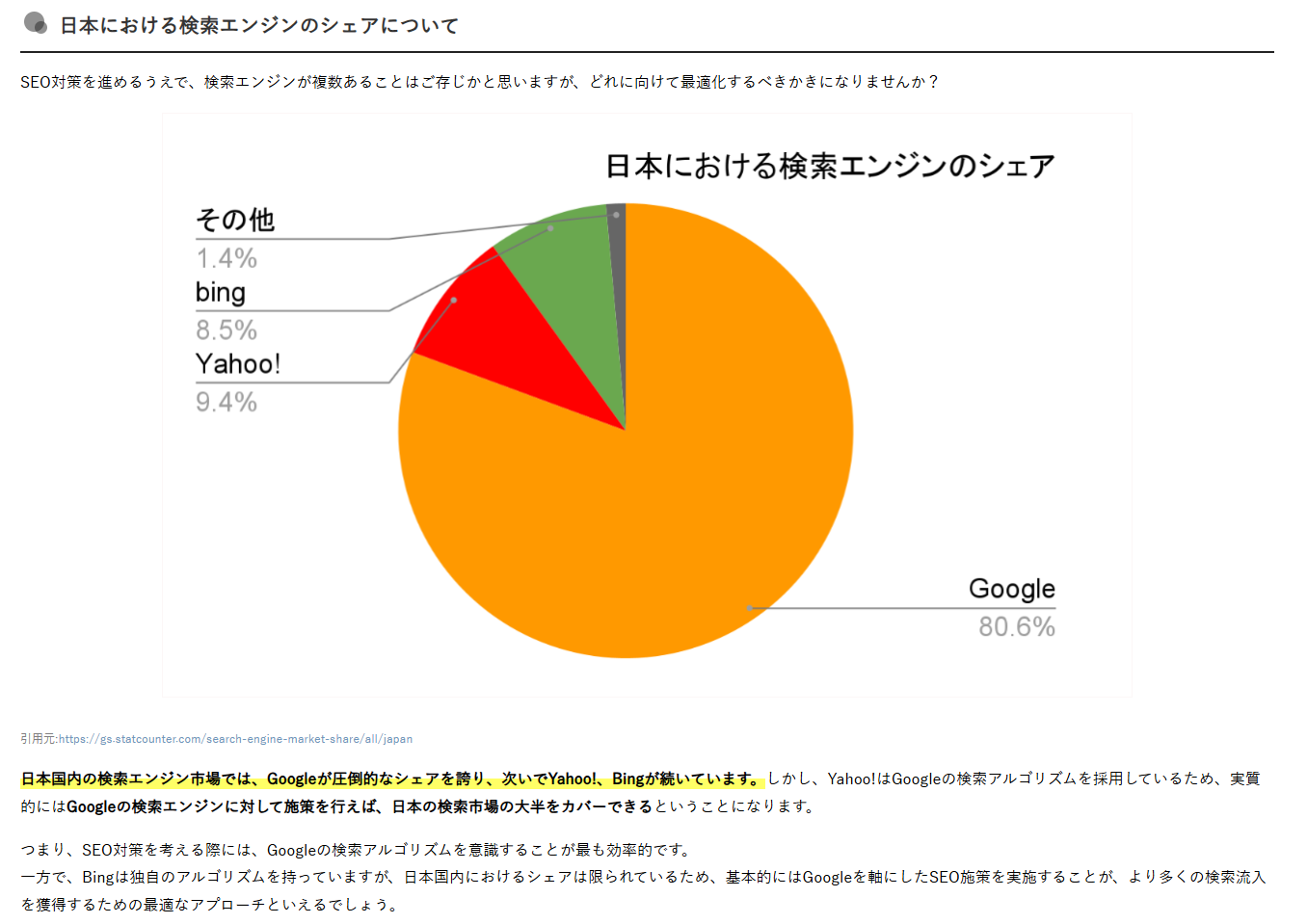 例えば、検索エンジンのシェア率を説明するテキストがあれば、その周辺にデータを証明する画像を配置するといった形です。
