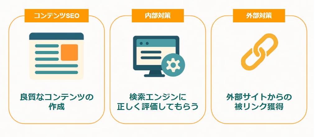 これらを細分化すると、SEO対策で行うべき手法は「コンテンツSEO」「内部対策」「外部対策」の3つに分類されます。